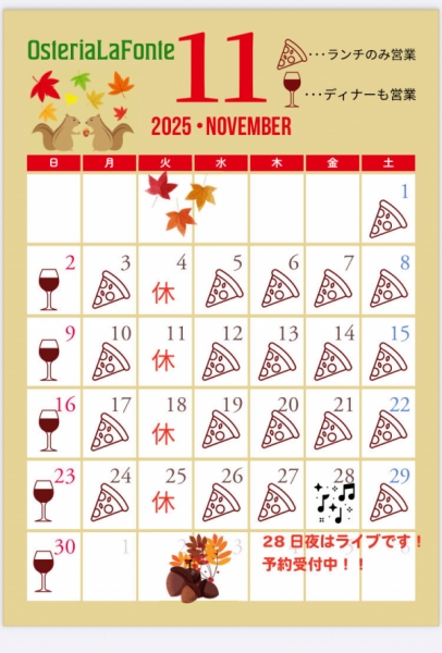 11月の営業カレンダーです 2025-11-04 20:05:38 🍁いつもオステリアラフォンテにご来店頂き、誠にありがとうございます😊あっという間の11月🍂で、寒さを感じる今日この頃となりました。11月も日曜日以外、ランチのみの営業となっておりますが28日(金)は、ランチ営業後、 ディナータイムに🎶jazzライブがございます❤️是非とも皆様お誘い合わせの上ご来店頂き、🍷お食事🍽と素敵な音楽🎹をお楽しみ下さい❣️#オステリアラフォンテ#福山イタリアン# jazzライブ#藤野めぐみヴォーカル#宮木賢人ピアノ